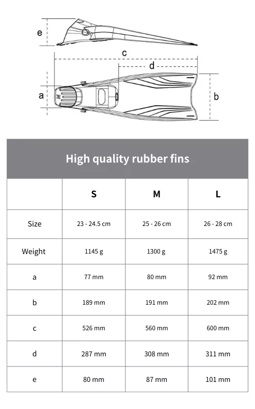 - ฟินดำน้ำยางพาราคุณภาพสูง – รุ่นความแข็งมาตรฐาน ผลิตจากยางพาราธรรมชาติที่มีคุณภาพสูง มีการสปริงตัวที่ยอดเยี่ยมและประสิทธิภาพในการว่ายน้ำอันทรงพลัง ให้คุณได้เพลิดเพลินกับความสนุกในการดำน้ำอย่างเต็มที่ การออกแบบหุ้มเท้าที่ห่อหุ้มได้ดี นอกจากเสริมประสิทธิภาพในการว่ายแล้ว ยังสามารถลดความเหนื่อยล้าของส่วนขา การออกแบบรูปร่างเพรียวลมและร่องตีน้ำ เพิ่มพลังขับเคลื่อนให้มากยิ่งขึ้น ขนาดของฟินดำน้ำที่แตกต่างกัน สไตล์ของรูปร่างอาจมีความแตกต่างเล็กน้อย ง่ายต่อการแยกแยะ ฟินดำน้ำยางพาราคุณภาพสูงสามารถซื้อเพิ่ม "สายรัดฟินดำน้ำแบบสปริง" เพิ่มเติม ช่วยให้สวมถอดรวดเร็ว มีที่จับตรงส้นเท้า ง่ายต่อการใช้งาน ใช้วัสดุสปริงสแตนเลส SUS304 ภายในสปริงรัดด้วยเชือกไนลอนป้องกันไม่ให้ยืดจนเกินไป S-สปริง 17 ซม. ความยาวรวม 36 ซม. M-สปริง 20 ซม. ความยาวรวม 39 ซม. L-สปริง 22 ซม. ความยาวรวม 41 ซม.