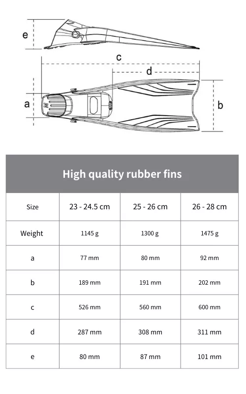 - ฟินดำน้ำยางพาราคุณภาพสูง – รุ่นความแข็งมาตรฐาน ผลิตจากยางพาราธรรมชาติที่มีคุณภาพสูง มีการสปริงตัวที่ยอดเยี่ยมและประสิทธิภาพในการว่ายน้ำอันทรงพลัง ให้คุณได้เพลิดเพลินกับความสนุกในการดำน้ำอย่างเต็มที่ การออกแบบหุ้มเท้าที่ห่อหุ้มได้ดี นอกจากเสริมประสิทธิภาพในการว่ายแล้ว ยังสามารถลดความเหนื่อยล้าของส่วนขา การออกแบบรูปร่างเพรียวลมและร่องตีน้ำ เพิ่มพลังขับเคลื่อนให้มากยิ่งขึ้น ขนาดของฟินดำน้ำที่แตกต่างกัน สไตล์ของรูปร่างอาจมีความแตกต่างเล็กน้อย ง่ายต่อการแยกแยะ ฟินดำน้ำยางพาราคุณภาพสูงสามารถซื้อเพิ่ม "สายรัดฟินดำน้ำแบบสปริง" เพิ่มเติม ช่วยให้สวมถอดรวดเร็ว มีที่จับตรงส้นเท้า ง่ายต่อการใช้งาน ใช้วัสดุสปริงสแตนเลส SUS304 ภายในสปริงรัดด้วยเชือกไนลอนป้องกันไม่ให้ยืดจนเกินไป S-สปริง 17 ซม. ความยาวรวม 36 ซม. M-สปริง 20 ซม. ความยาวรวม 39 ซม. L-สปริง 22 ซม. ความยาวรวม 41 ซม.